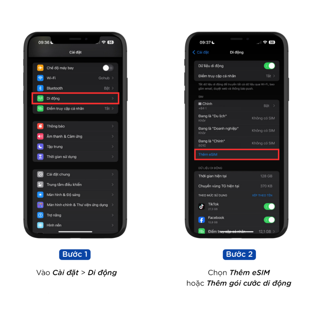 Bước 2: Chọn Thêm eSIM hoặc Thêm gói cước di động