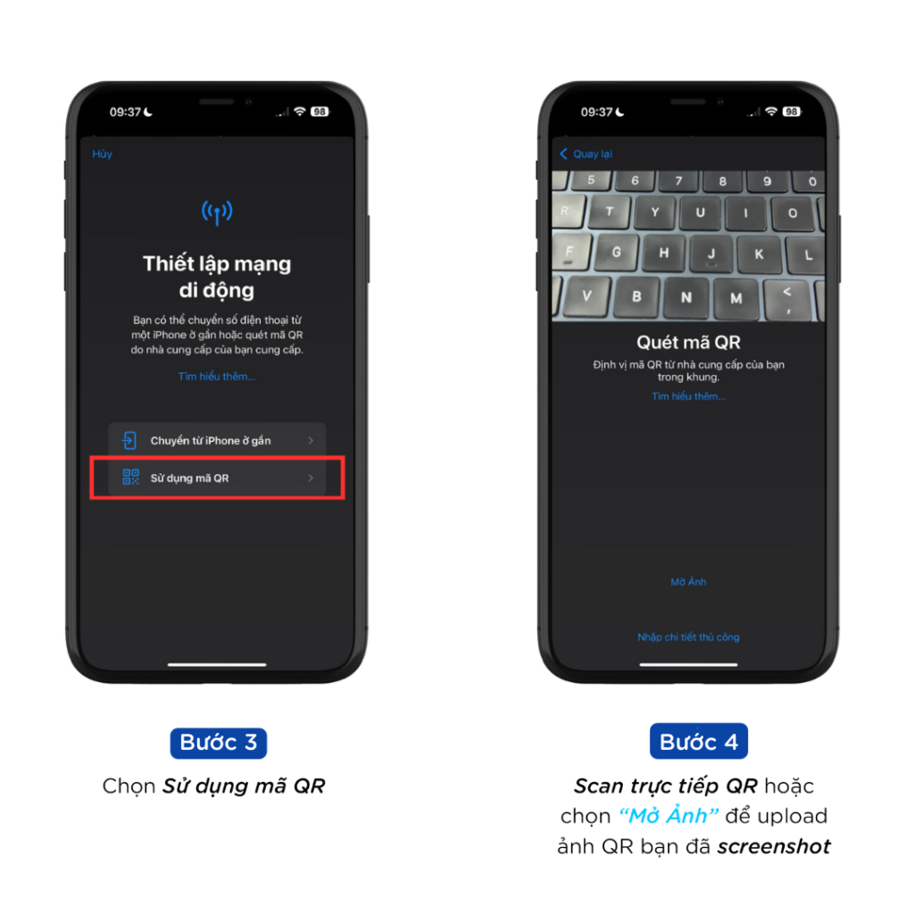 Bước 4: Quét mã QR geneSIM gửi qua email hoặc chọn Nhập mã thủ công và sao chép mã từ email nếu không thể quét QR bằng thiết bị. Ngoài ra bạn cũng có thể chọn Mở ảnh để upload hình mã QR bạn đã screenshot