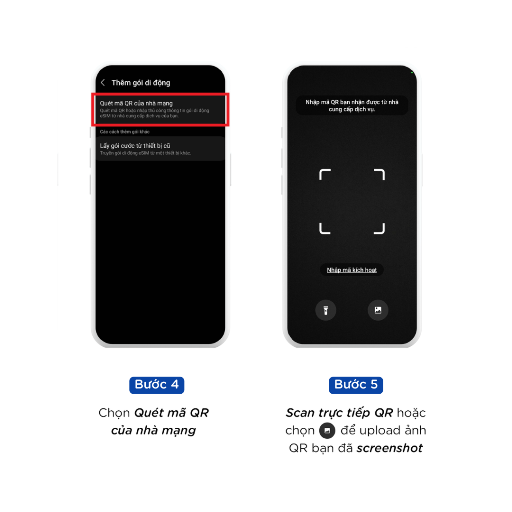 Bước 5: Quét mã QR geneSIM gửi qua email hoặc chọn Nhập mã thủ công và sao chép mã từ email nếu không thể quét QR bằng thiết bị. Ngoài ra bạn cũng có thể Upload hình mã QR bạn đã screenshot